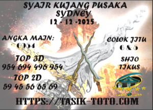 Buat itu disini kita siapkan layanan syair togel sydney resmi buat kamu yang ingin lebih mencari prediksi syair togel sdy saat ini. Maka tidak usah takut, karena Prediksi TasikToto akan memberikan kalian bocoran syair togel hari ini yang jitu dan bisa dijadikan untuk membuat prediksi ramalan togel sdy setiap harinya.